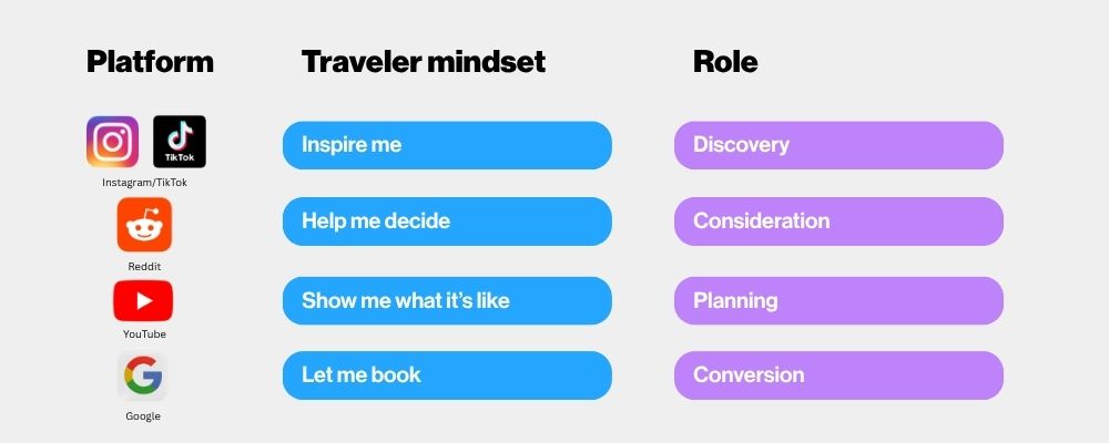 Every platform plays a different role in the travel decision process. Here’s a breakdown: